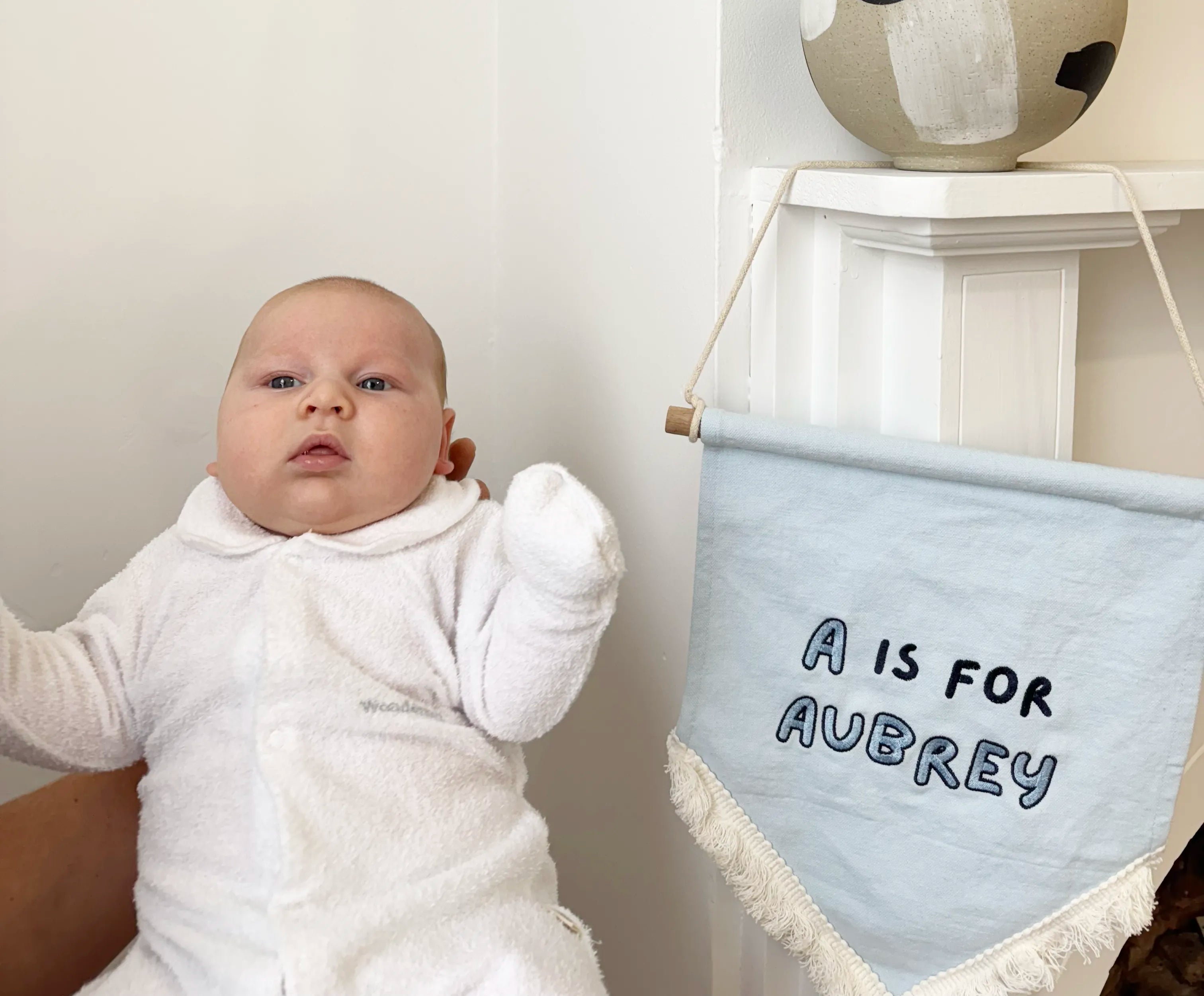 Our personalised wall hangings paired with your cute new baby make for the ultimate birth announcement photo