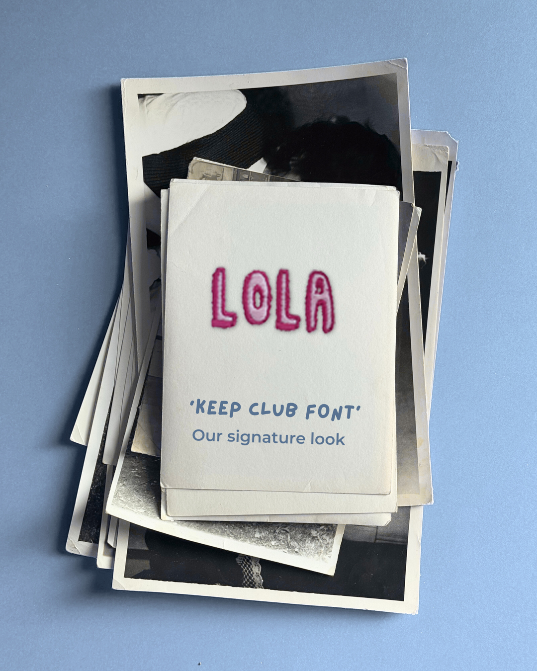 Our signature look. Hand drawn font with a light fill and contrasting outline. This style is our most popular and looks great across all our products, but a crowd favourite is Keep Club on the knit jumper.